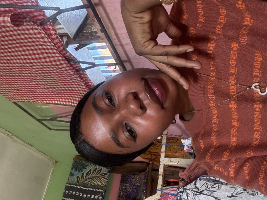 A woman with dark skin and glossy lips poses indoors. She wears a brown sweater with a repeating pattern and a gold necklace with a heart-shaped pendant. A small stud adorns her nose. In the background, a window with a red and white checkered curtain is visible. To the left, a green wall and a stack of pillows are present. The overall image is a close-up selfie.