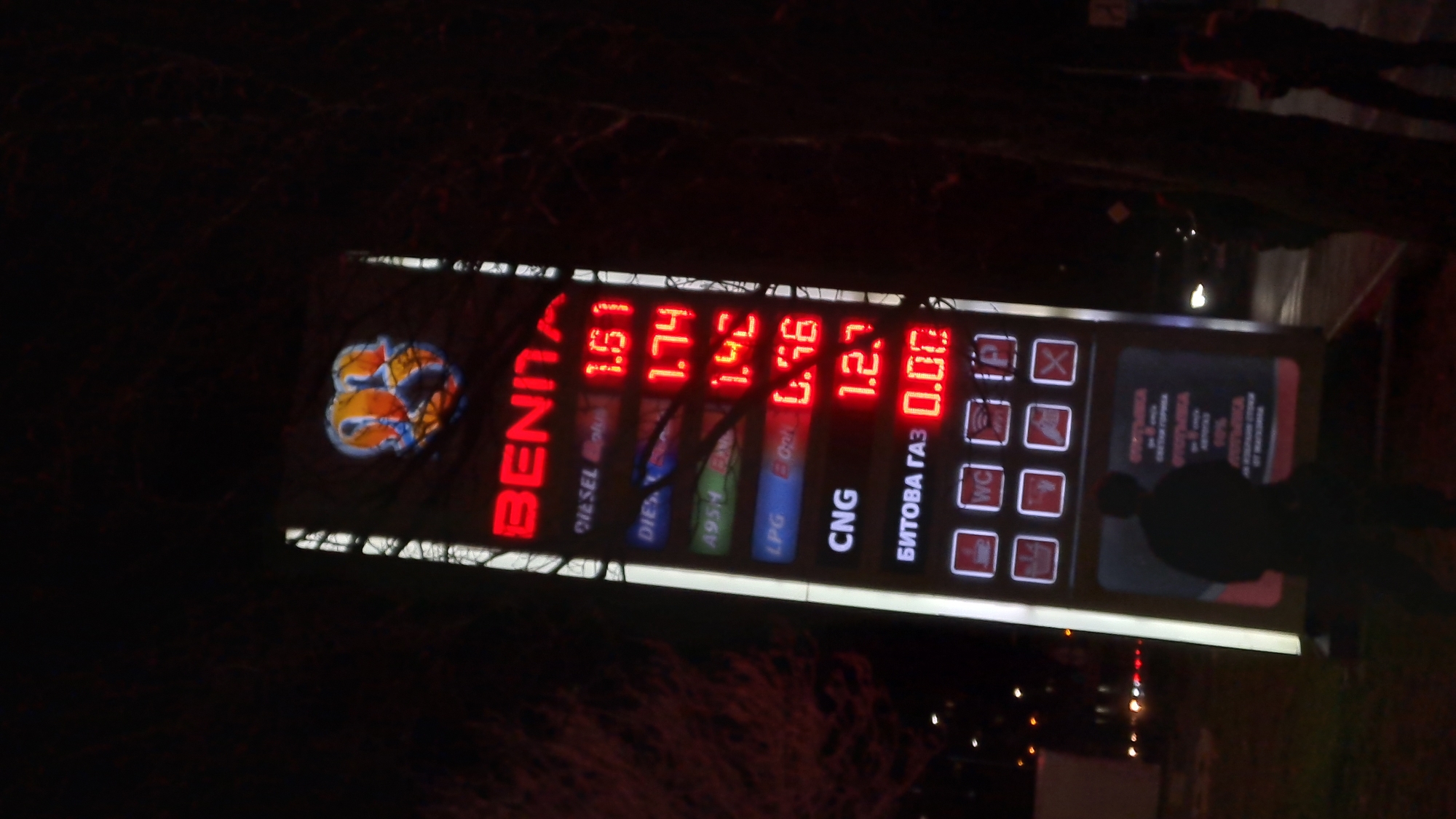 A nighttime vertical shot depicts a brightly illuminated digital display sign for a "BENITA" gas station