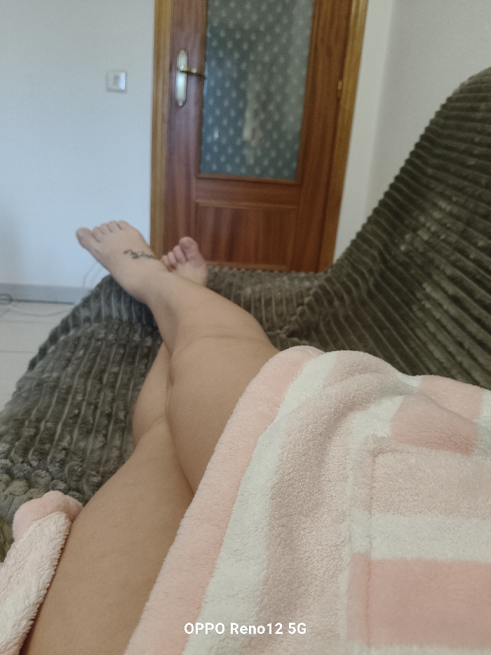 The image presents a first-person perspective of an individual resting indoors. The subject's bare legs are crossed at the ankles, with a small, dark-colored tattoo visible on the top of the left foot. The individual is covered from the mid-thigh downwards by a soft, fuzzy blanket or robe, displaying alternating horizontal stripes of light pink and white. The person appears to be seated on a textured, dark grey or brown sofa or lounge chair. In the background, a plain white wall on the left features a rectangular light switch. To the right, a wooden interior door with a frosted or patterned glass panel is partially visible. The scene is consistent with a private residential interior. No specific visual identifiers are present within the image to confirm its precise location in Cuéllar, Spain. An "OPPO Reno12 5G" watermark is present at the bottom of the image.