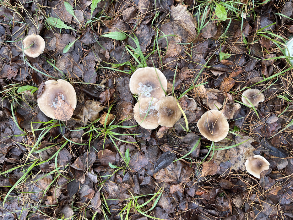 The image presents an overhead view of a forest floor located in Petriškė, Lithuania. The ground is largely obscured by a dense layer of brown, decaying broadleaf foliage, interspersed with scattered pine needles and patches of vibrant green grass and small herbaceous plants. Multiple mushrooms are visible, characterized by their light brown to tan caps, varying in size from approximately 2 cm to 8 cm in diameter. Several of these mushroom caps, particularly those grouped in the central and upper-central portions of the frame, are partially covered with white, crystalline frost or ice. One larger mushroom in the upper-central area has a single brown, brittle leaf resting on its frosted cap. The overall scene suggests a cold, possibly freezing, environment. There are no individuals, animals, or artificial objects present within the frame.