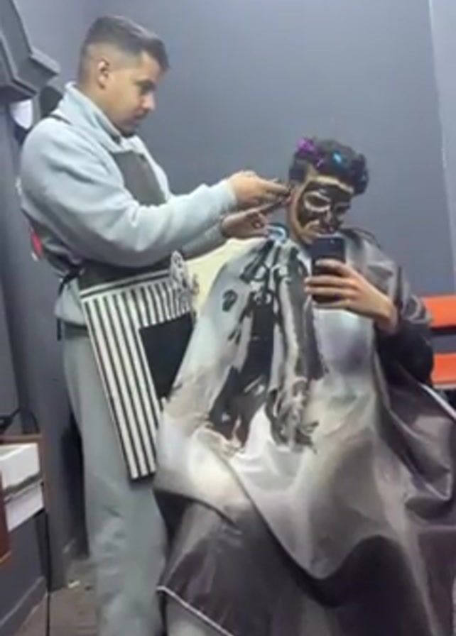 The scene shows a man in a barbershop having his hair cut. The barber, wearing a grey sweatsuit and a striped apron, is carefully trimming the client's hair with scissors and a comb. The client is seated, draped in a patterned cape, and appears to be taking a selfie with his smartphone. He has a dark facial mask on his face and colorful clips in his hair. The barbershop has grey walls and simple furnishings, including a mirror, a table, and an orange seat. The overall setting suggests a routine grooming appointment.