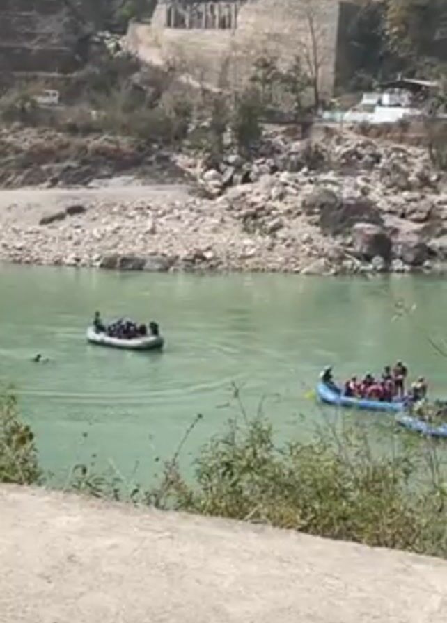 two rafts on a wide, light green river. Each raft is filled with people, and they appear to be engaged in a water activity. To the left of the rafts, a person is swimming in the river. The river bank is covered with light-colored rocks and vegetation. In the background, there is a building or structure on a hill, appearing aged and made of light-colored stone or concrete. The sky is light and hazy, suggesting a sunny day. The camera is positioned at a slightly elevated angle, capturing the scene from a stationary position. A portion of a grey pavement is visible in the foreground, partially obscured by vegetation.
