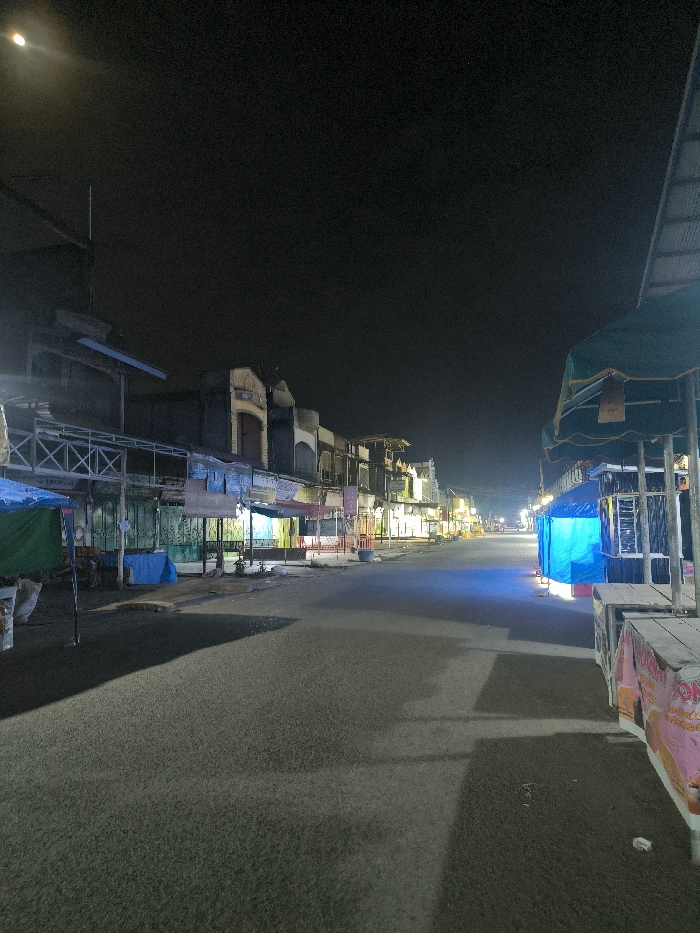 The image displays a deserted street scene at night in Gampongteungoh, Indonesia
