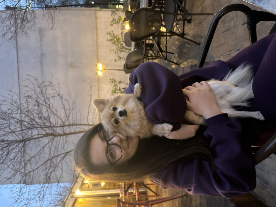 - "The image depicts a young adult female seated outdoors at what appears to be a cafe or restaurant patio in Sofia, Bulgaria, holding a small, light-brown fluffy dog" by FM-GVzNi2, licensed under CC BY 4.0