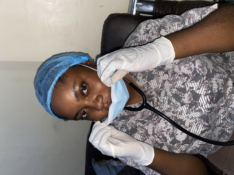 A person wearing a blue surgical cap, a patterned gray and white shirt, and white gloves pulls down a blue face mask. A stethoscope hangs around the person's neck. The individual has dark skin and is looking directly at the camera. They are sitting on a dark leather chair. The background is a plain, light-colored wall.
