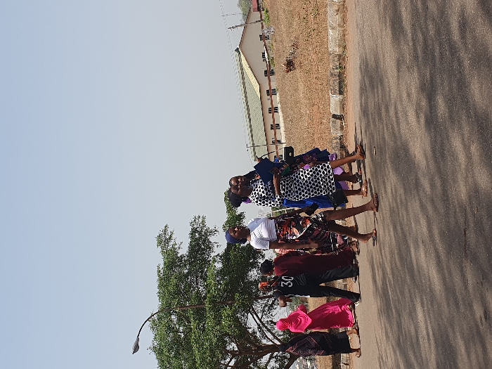 The image displays approximately ten individuals, predominantly women, walking from left to right on an asphalt road under a clear, bright sky in Ogbogbo, Nigeria