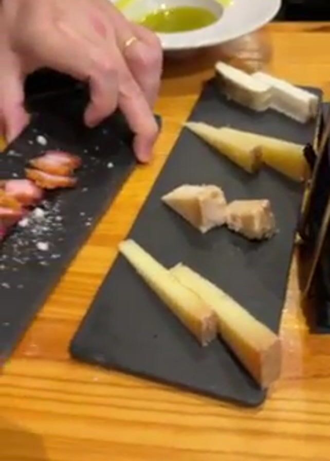 A wooden table displays two black serving plates. One plate holds a row of sliced meat sprinkled with salt. The other plate has an assortment of cheese cut into various shapes, including triangle and rectangular prisms. A small white dish of green liquid is placed on the upper left part of the table. A cell phone lies on the table near a wine glass. A black cheese knife is on a cheese plate, and a black stand holds the knife. A man reaches out with his hand. Other people are in the background.