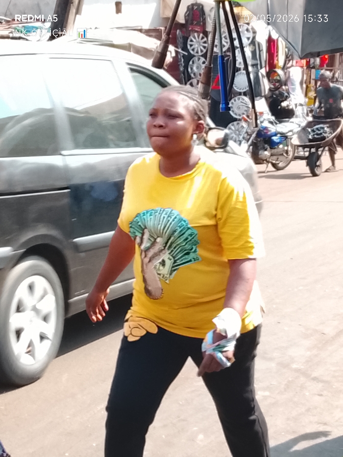 A woman in a yellow T-shirt with a graphic of a hand holding cash walks on a sunny street next to a dark-colored van. She wears black pants and has a bandage wrapped around her left hand. Behind her, a motorcycle and a person pushing a wheelbarrow are visible, along with a street vendor's display of car accessories. The date "02/05/2026 15:33" is visible in the upper right corner of the image.