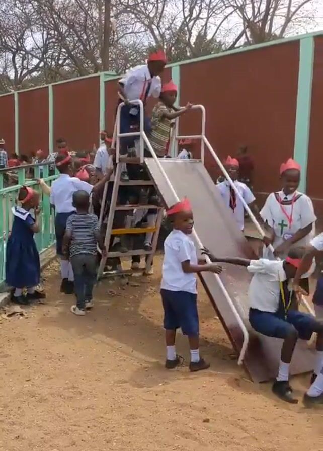 A playground scene unfolds with a group of children, mostly clad in school uniforms of white shirts and blue shorts or dresses, playing on and around a metal slide. Many are wearing red hats with tassels. The slide is placed on a sandy ground. Some children are climbing the ladder to the top of the slide, while others are sliding down. The environment is enclosed by a red and green wall, with trees visible in the background under a cloudy sky. The camera remains relatively still, capturing the lively activity of the children.