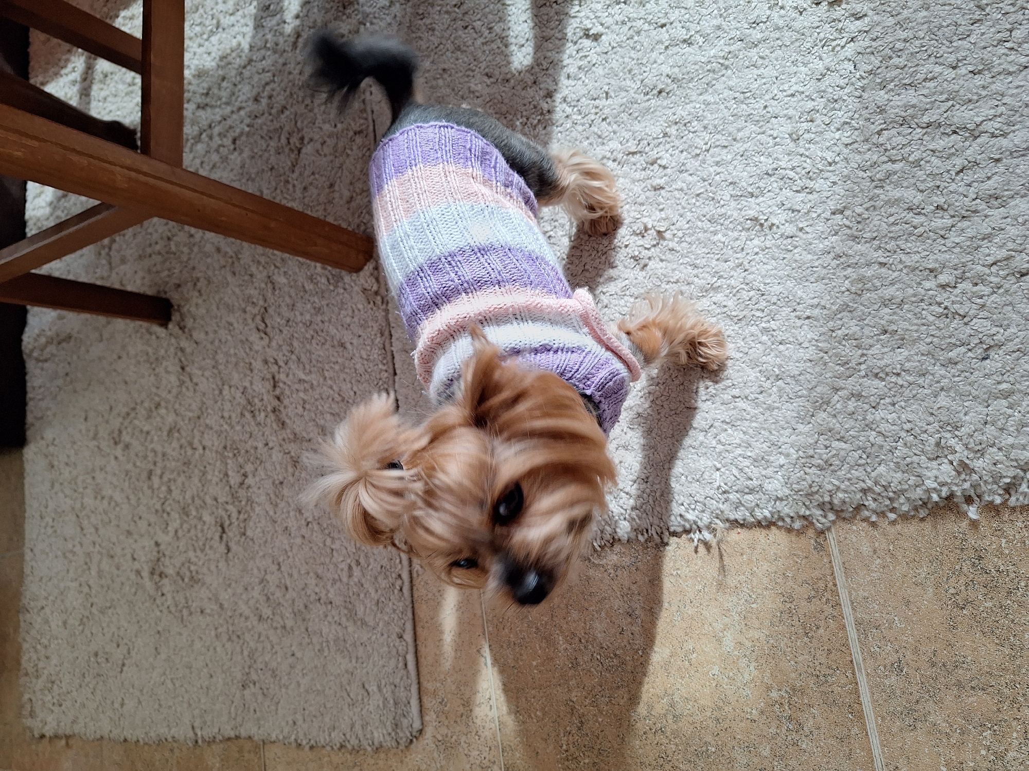 - "A small Yorkshire Terrier dog is standing on a beige shag carpet, wearing a striped lavender, white, and pink sweater" by FM-Ac1q33, licensed under CC BY 4.0