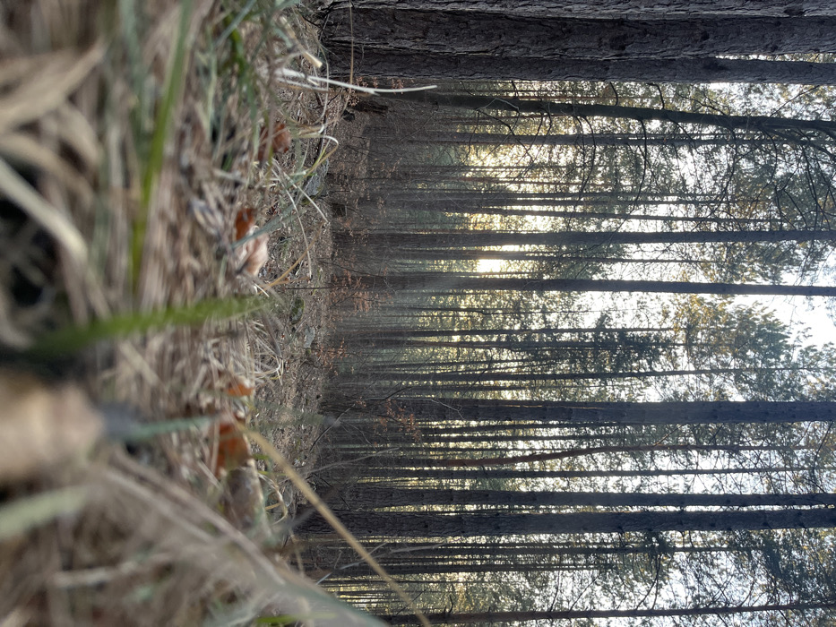 The image depicts a low-angle view of a conifer forest located near Vladaya, Bulgaria. The foreground is dominated by dry, brown grasses and scattered green blades, along with fallen dead leaves in hues of orange and brown, occupying the lower third of the frame and appearing out of focus. The forest floor beyond the immediate foreground consists of dirt and sparse vegetation, with several small tree saplings visible, particularly towards the center. Numerous tall, slender pine trees with dark, straight trunks densely populate the midground and background, extending upwards beyond the frame. Sunlight filters through the trees from the left-center background, creating a bright glow and casting rays that illuminate the scene with a warm, soft light, suggesting either early morning or late afternoon. No individuals, animals, or man-made objects are present in the scene. The overall environment is a natural woodland setting.