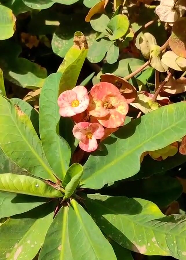 close-up of a plant with green leaves and small, pink and orange flowers with yellow centers. The plant is outdoors and lit by sunlight. The camera slightly zooms in on the flowers. The plant also features sharp thorns at the base of each leaf group.