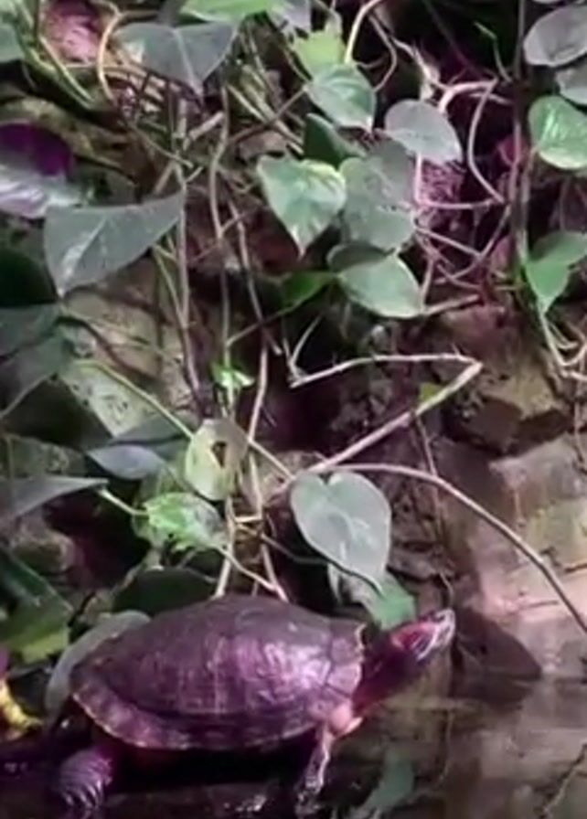 red-eared slider turtle resting near water in an enclosure with lush, green vegetation. The turtle, identified by the distinctive red markings near its ears, is partially submerged on a rock or log. Above the turtle, a variety of green plants with heart-shaped leaves and tendrils cascade down a rocky background, creating a naturalistic habitat. The water is dark and reflects the turtle's form.
