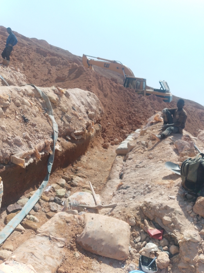 The image depicts an outdoor excavation site on a dry, sloping hillside under clear, bright daylight in the city of Unknown, Unknown