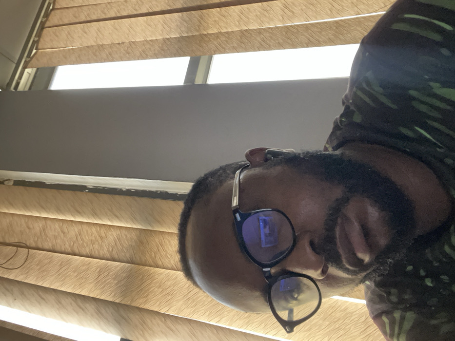 A dark-skinned male subject with short dark hair and a full dark beard is depicted in a close-up, upward-angled shot. He wears black-framed eyeglasses with metallic temple accents; a blue-hued reflection of a screen is visible in the right lens. A dark earbud is present in his right ear. He is dressed in a dark, possibly camouflage or abstract patterned, short-sleeved garment. The subject maintains a neutral expression, looking directly towards the camera. The background consists of light brown or beige vertical blinds with a textured appearance. To the subject's upper right, a vertical section of a window reveals bright natural light, indicating an outdoor view. A segment of a plain grey wall is visible between the blinds and the window opening. Thin dark lines, possibly electrical cables, are visible near the top center edge of the image, hanging slightly. The setting is indoors, consistent with an office or room with windows. The specific location within Abuja, Nigeria, cannot be determined from the visual information provided.