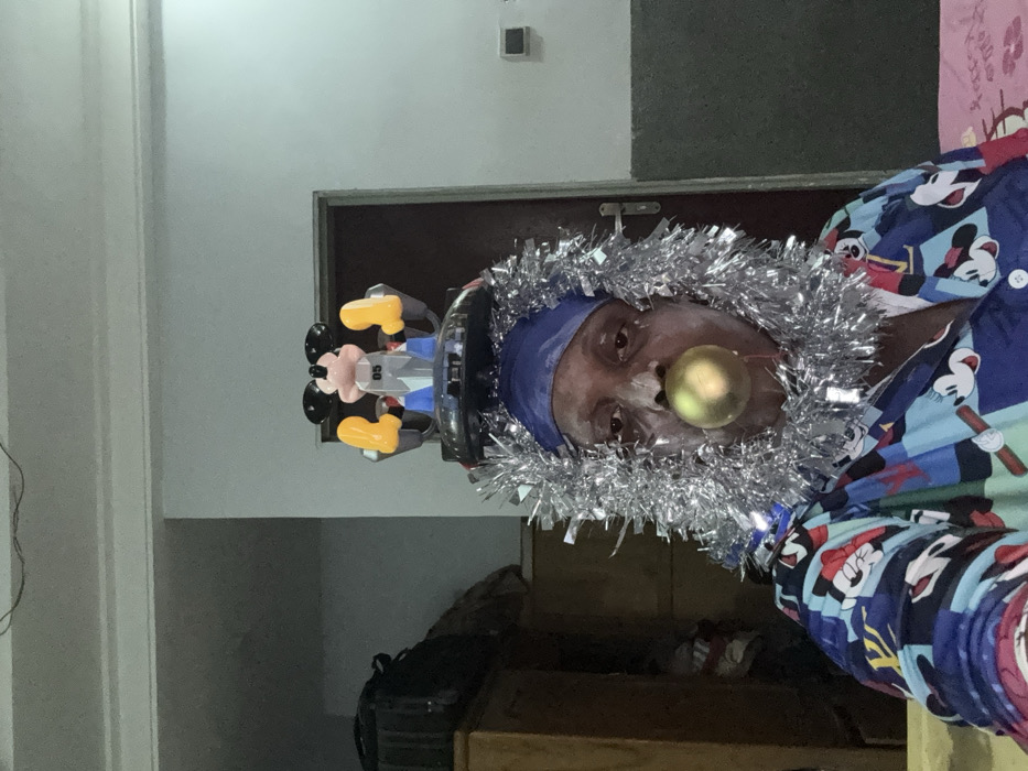 A person wears a blue head covering, a garland around their neck, and a gold ornament on their nose. A Mickey Mouse toy sits atop their head. They wear a blue pajama top with Mickey Mouse designs. The background includes a closed door, wall, storage chest, and a pink blanket.