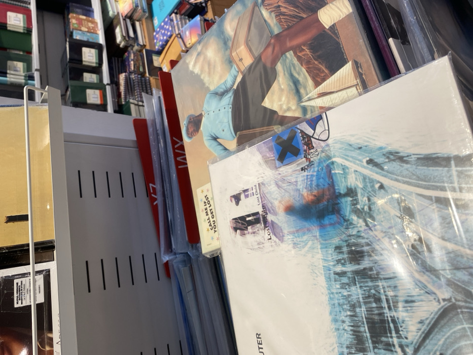 The image depicts an indoor retail environment, identified as a Libreria Feltrinelli location, likely at Corso d'Augusto, 137, Rimini, Italy. In the immediate foreground, a stack of music albums, predominantly vinyl records, is displayed on a lower shelf. The most prominent album is "CALL ME IF YOU GET LOST" by Tyler, The Creator, showcasing its full cover art depicting a figure in a light blue cardigan, black shorts, and hat, holding a briefcase against a mountainous and nautical landscape. To its left, partially obscured, is an album cover for "OK Computer" by Radiohead, primarily white with blue abstract elements and the text "COMPUTER" visible, encased in plastic with multiple stickers including "Lost Child" and a blue "X" graphic. Above these albums, a white metal shelf with horizontal perforations is visible. To the right, an extensive collection of books, notebooks, and stationery items are neatly arranged on multiple shelves, some featuring the characteristic Feltrinelli "W" logo on their spines. All displayed items appear to be new and available for purchase. No individuals are visible.