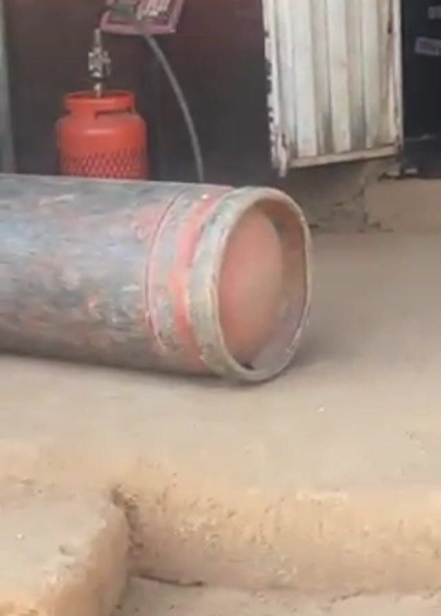 storefront with a white metal door partly open. A red gas tank is lying on its side on the ground in front of the store. Several people are standing inside the store, and their lower bodies are visible. The ground is sandy and dusty. The video appears to be shot from across the street or a similar distance. The scene is somewhat blurry.