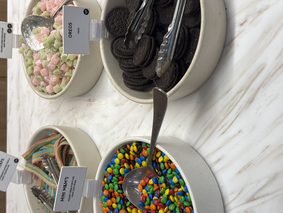 Four bowls of candy rest on a marble surface. The top left bowl contains small, pink and green candies with a scoop. Next to it, a bowl of Oreo cookies has metal tongs. Below, rainbow-colored candy strips are in a bowl with tongs. Adjacent, a bowl of colorful mini M&M's contains a spoon. Labels for "OREOS" and "MINI M&M'S" are visible, as well as "VF" symbols.