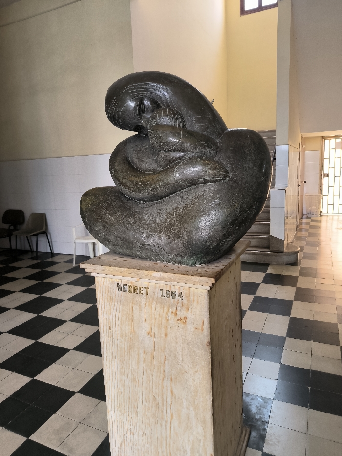 An indoor scene in Perímetro Urbano Cúcuta, Colombia, features a dark, abstract bronze sculpture prominently positioned on a light-colored wooden pedestal. The sculpture depicts a stylized, organic form resembling a figure curled inward, possibly kneeling or seated, with intertwined limbs and a downward-facing head. The pedestal is marked with the inscription "NEGRET 1954" on its front face. The floor is composed of large black and white checkered tiles. The walls are two-toned, with a light beige upper section and a lower section clad in white rectangular tiles. To the left of the sculpture, three chairs are visible: two dark office-style chairs and one white plastic chair. To the right, a staircase with light-colored treads and white risers ascends. A brightly lit doorway with a grid-patterned panel is visible in the far right background, with a high window positioned above the staircase.
