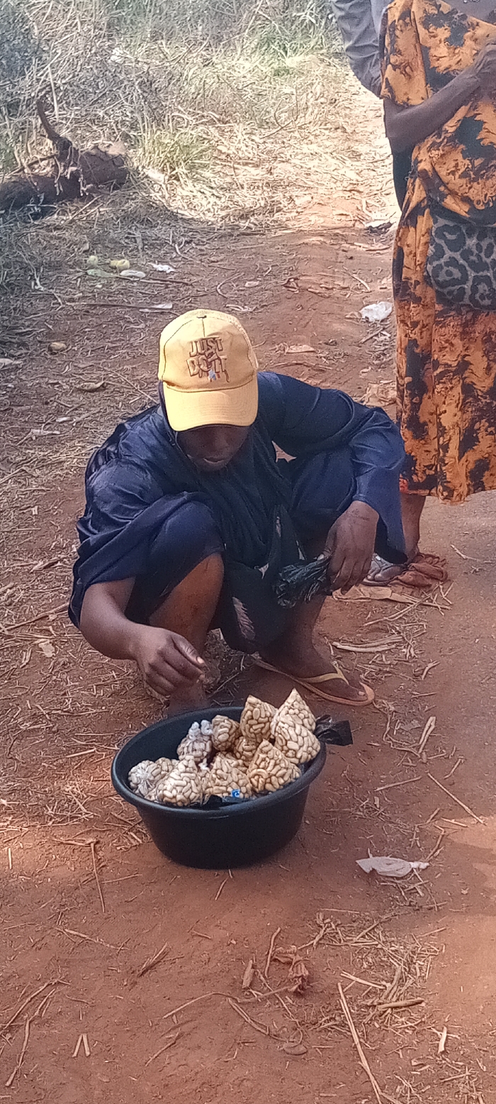 The image depicts an outdoor scene in an unpaved area of Unknown, Unknown, with reddish-brown dirt ground. A person is squatting in the foreground, wearing a dark blue long-sleeved garment and a yellow mesh-back baseball cap embroidered with 'JUST DO IT'. Their bare arms and lower legs are visible, and they wear light-colored flip-flops. Their right hand is extended towards a black plastic basin on the ground, which contains numerous small, individually wrapped items in clear plastic or translucent material. These items are light beige to off-white and possess a textured, convoluted, brain-like surface. The person's left hand holds a bundle of dark green leafy material. To the right and slightly behind, the lower half of another person is partially visible, wearing an orange and black patterned dress with a leopard print section and light-colored flip-flops. A third person in grey clothing is partially visible further back. The environment consists of dry, reddish-brown earth with scattered natural debris, including twigs and dry grass, along with some discarded plastic. Natural daylight illuminates the scene.