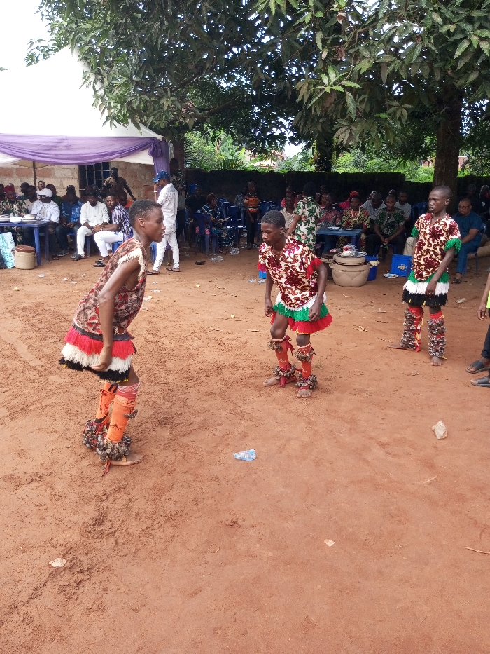 An outdoor scene in Oko Town, Nigeria, depicts an event with traditional performers and an audience