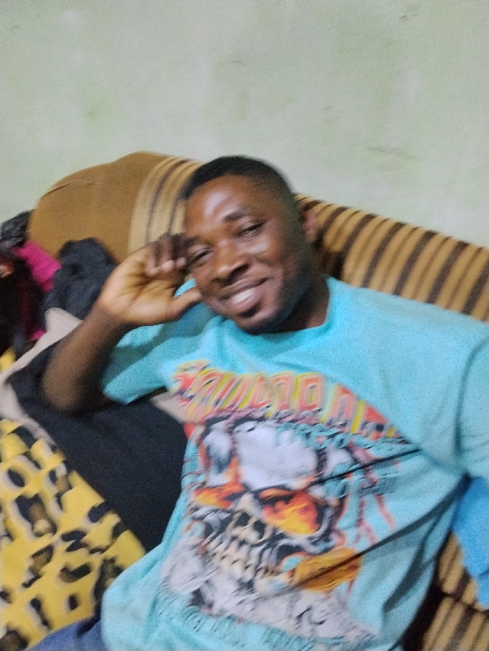 An adult male is depicted in a close-up, indoor shot. He is seated on what appears to be a striped brown and tan sofa, with various articles of clothing, including a pink garment and a black fabric, visible to his left. The male is dark-skinned, with short, dark hair and a clean-shaven face. He is wearing a light blue short-sleeved t-shirt featuring a multi-colored graphic design on the chest, which includes what appears to be a stylized skull or face surrounded by various patterns and colors. His right hand is raised to his head, with his fingers lightly touching his temple area, and he is smiling broadly, revealing teeth. The background consists of a light-colored, possibly off-white or very light green, wall that shows some discoloration or marks. The lighting suggests an interior setting, possibly residential. The image depicts a scene from a location within the city of Gama, Nigeria.