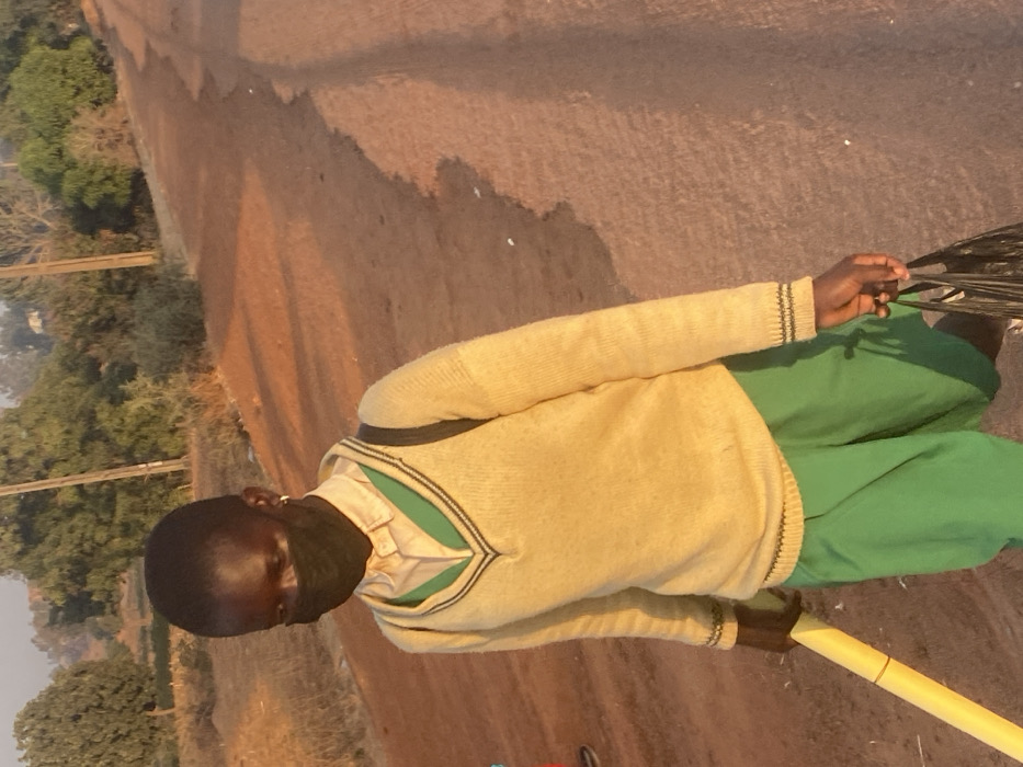 A person wearing a black face mask, a tan sweater with a dark trim around the V-neck and cuffs, and green pants stands on a dusty road. They hold a bundle of dark sticks or wires in one hand and a yellow pole in the other. The background shows trees and vegetation, suggesting a rural or roadside environment. The image is slightly angled, with a warm, natural light.
