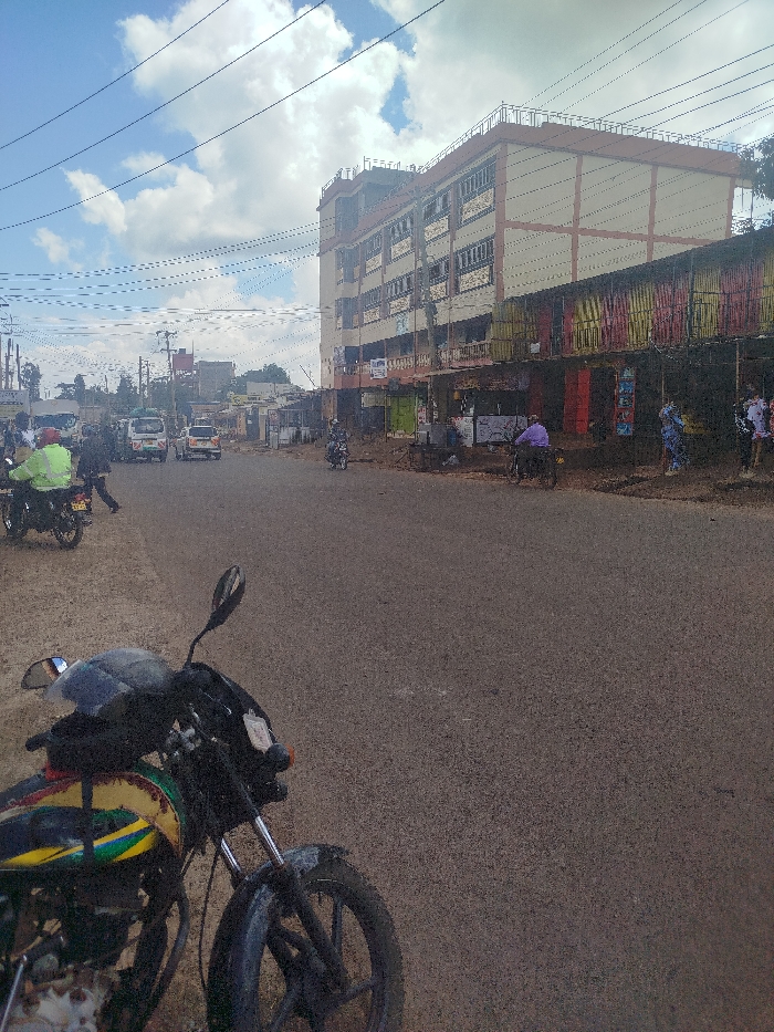 This image captures a street scene in Kihara ward, Kenya, on a partly cloudy day