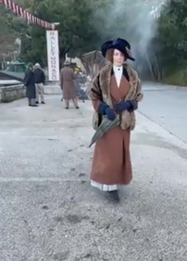 A woman in vintage attire walks down a cracked road, turns, and looks toward a smoking structure. She wears a brown coat, a fur-trimmed shawl, blue gloves, and a navy hat. She carries a green umbrella. In the background, men in period clothing stand near a banner that reads "Rallye Monaco". Smoke billows from a wood structure, and trees cover a hillside in the distance.