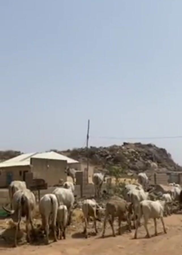 herd of light-colored cattle moving along a dirt road in what appears to be a rural area. There are several buildings in the background made of cinder blocks, some with corrugated metal roofs. A rocky hill rises behind the buildings. The sky is clear and light blue. The cattle are mostly walking slowly, and their shadows are visible on the dusty ground.