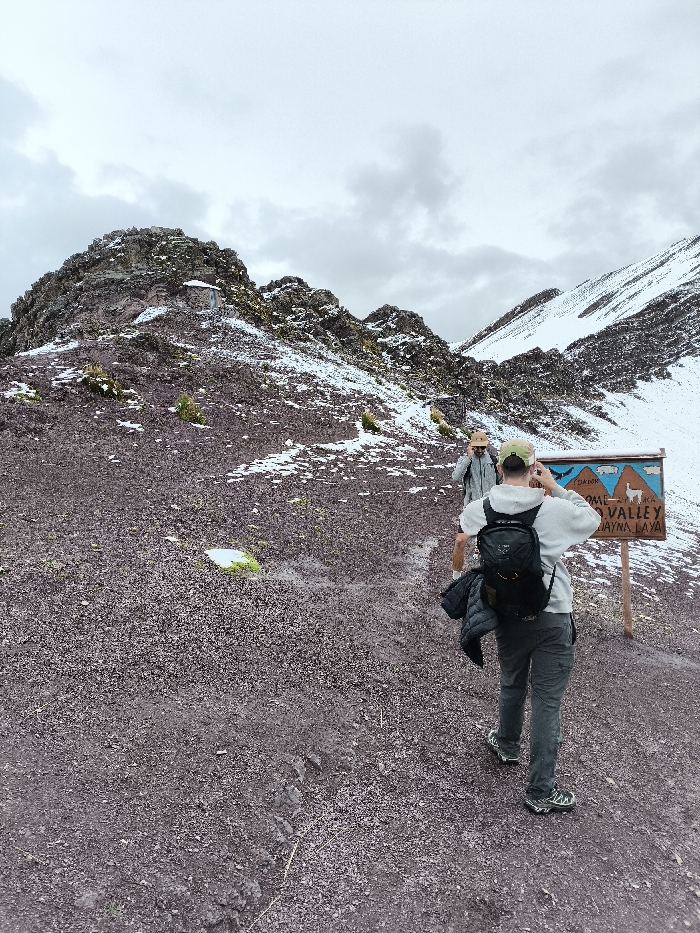 Two hikers traverse a rugged, brown-toned landscape dotted with snow. A weather-beaten sign with text in Spanish stands to the right. The sky is overcast. A mountain range, partially covered in snow, rises in the background. The hiker in the foreground carries a black backpack and appears to be adjusting something on their head.