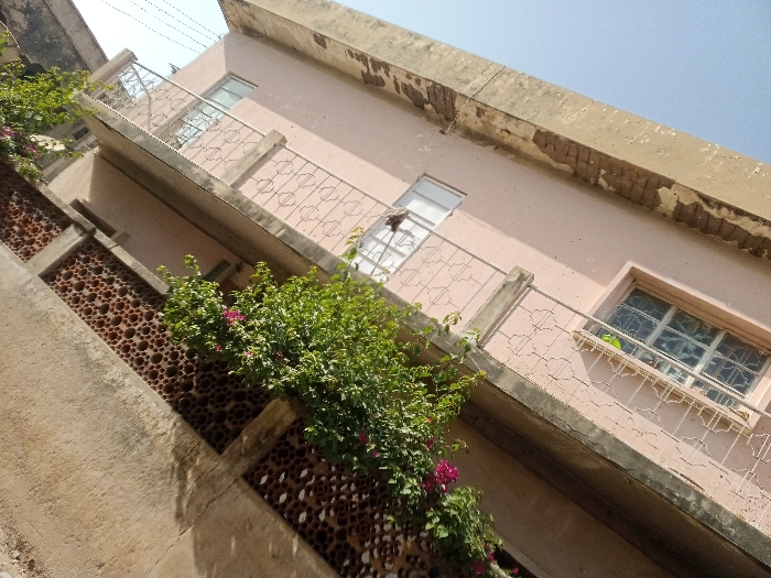 A two-story, light pink building features decorative concrete walls with circular openings. Lush green plants with pink flowers climb the wall near the lower balcony. The balconies have light-colored railings with a geometric pattern. Windows with divided panes are visible on both floors. The building's concrete trim shows signs of age and wear. The sky is a clear, pale blue in the background.