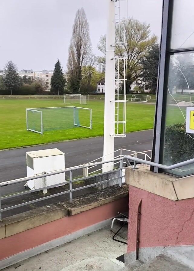 sports field. A person is walking up concrete steps in a stadium-style seating area with wood benches. The sports field has a green grass surface, running tracks and soccer goals. There is a white structure to the right of the field with a yellow sign in the window reading "ATTENTION PEINTURE FRAICHE." The person walks over to the benches and sits down. The person is wearing a black jacket with white stripes on the sleeves, black pants, and black shoes. They put their head down on their knees. The sky is overcast.