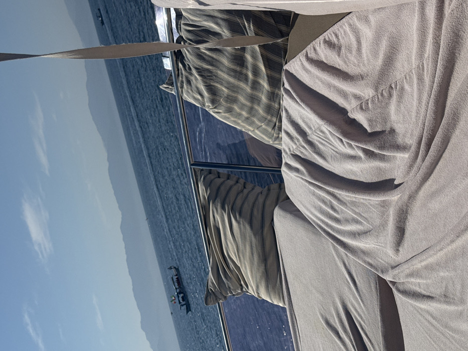 The photo depicts a scene from a boat. The blue sea stretches out to a distant, hazy landmass under a light blue sky with scattered clouds. The foreground features a padded seating area with striped pillows and a light gray cover. A chrome railing adds to the nautical atmosphere. A boat can be seen in the distance. The picture has been taken with a slight rotation, emphasizing the depth of the water and the open sky.