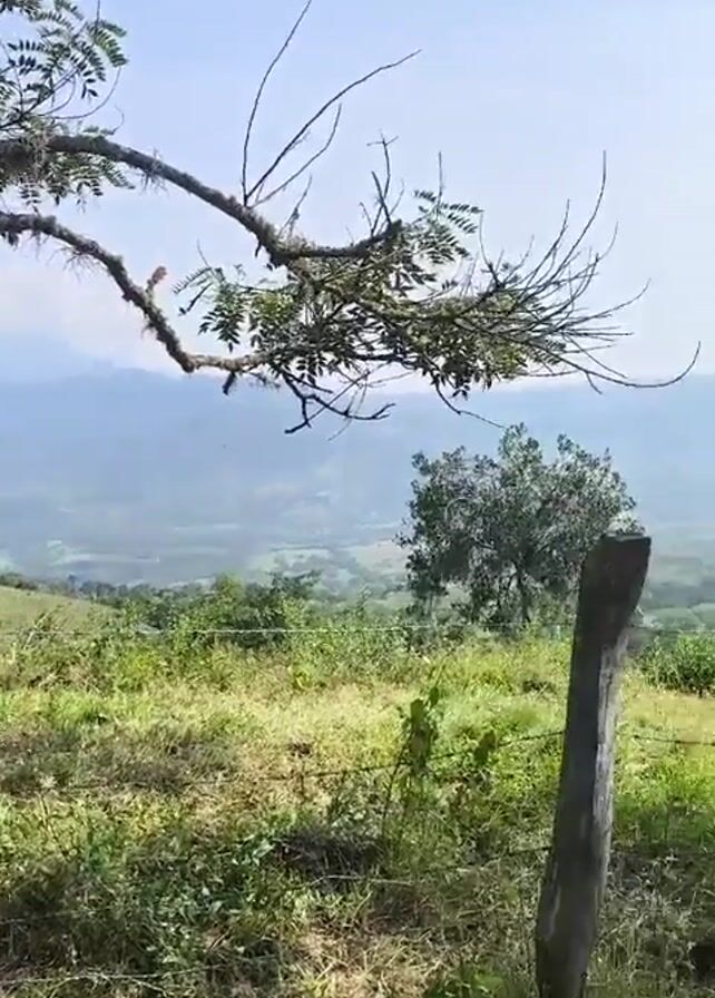 view of a valley from a hillside. In the foreground is a grassy field with a barbed wire fence supported by wooden posts. The camera pans slowly to the right. Beyond the field is a dense, green valley, with trees covering the lower ground. In the distance are mountains fading into a hazy sky. The sky is light blue. Branches of a tree with green leaves hang in the upper left corner of the frame.