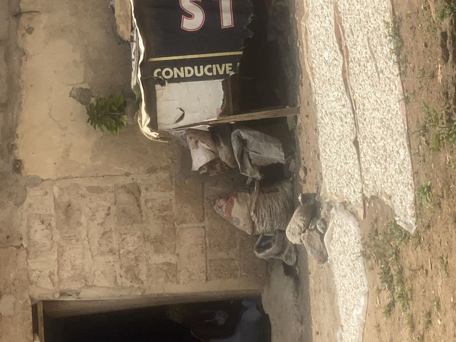The scene depicts an outdoor area in Idiroko, Nigeria, under bright daylight conditions. In the foreground, two rectangular sections of light-colored material, possibly tarps or woven mats, lie on dry, reddish-brown soil, covered uniformly with small, irregularly shaped, light-colored pieces, consistent with agricultural produce drying. Sparse green vegetation grows on the surrounding ground. To the left, a building with a rough, unpainted, light-brown block wall is visible. An open doorway reveals a person seated within, partially obscured, wearing light-colored attire. Against the building's wall, to the right of the doorway, several large sacks are present; one appears to be a woven sack with red and white markings, while others are grey. A small pile of grey rocks rests on the ground in front of these sacks. Further to the right, a makeshift structure is erected, supported by a wooden pole. It features a black covering with a vertical white section displaying the word "CONDUCTIVE" in black capital letters, with a large, partially visible white "S" to its right. A lighter fabric drapes over the top of this structure. Behind or on top of this structure, against the wall, a small green plant is visible.