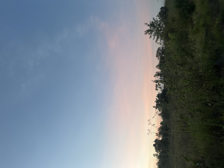 The image showcases a serene landscape during either sunrise or sunset. The left portion of the frame is dominated by a gradient sky, transitioning from a light blue to a soft pinkish hue. On the right, lush greenery and trees line the horizon, their silhouettes contrasting against the colorful sky. The overall impression is one of natural beauty and tranquility.
