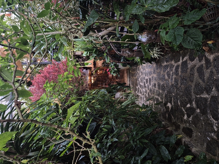 The image depicts a stone pathway leading through a dense, lush garden environment in Thôn 5, Vietnam. The pathway, constructed from irregularly shaped dark stones set in lighter mortar, appears damp or wet. It extends from the foreground directly towards a illuminated structure in the background. On both sides of the pathway, a variety of green foliage, including large-leafed plants, ferns, and vines, forms a thick canopy, partially obscuring the overhead view. In the mid-ground, above the pathway, a cluster of vibrant reddish-pink flowering plants is prominently visible. Several light-colored, bell-shaped flowers also hang from overhead branches. To the right of the pathway, two decorative, woven basket-like objects containing spherical elements are suspended from wooden posts. The structure at the end of the path appears to be an entrance, possibly to a cafe or building, with warm artificial light emanating from within, revealing interior details like tables and chairs. Potted plants are positioned near this entrance. No individuals are present in the scene. The overall atmosphere suggests a secluded, verdant outdoor or semi-enclosed space.