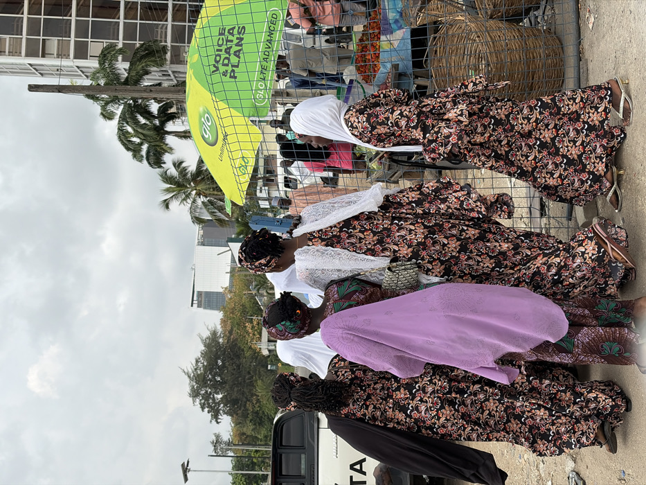 The image depicts an urban street scene in Lagos, Nigeria, specifically near Alfred Rewane Road in Ikoyi, evidenced by the modern glass-clad high-rise building visible in the distant background. Six women are prominently featured in the foreground, walking away from the viewer towards the right. Five of these women wear identical long, loose-fitting dresses with a black base and a detailed floral pattern in red, orange, and cream tones. The sixth woman, positioned centrally, wears a similar dress with a greenish-brown patterned fabric. Head coverings vary among the women: one on the far right wears a white hijab, another (center-right) has a white lace shawl draped over her shoulders, and a third (center-left) has a lavender shawl draped over her left shoulder. One woman on the far left wears a plain black outer garment over her patterned dress. Footwear consists of open-toed sandals, some with low heels. One woman (center-right) carries a small, light-colored, structured handbag. To the right in the midground, a prominent yellow and green "Glo" branded umbrella, advertising "Unlimited Voice & Data Plans" and "GLO LTE Advanced," shades a market stall. Below the umbrella, large woven baskets contain red produce, likely tomatoes or peppers. A low metal barrier extends across the midground. The ground in the immediate foreground is unpaved earth or gravel. The background shows a bustling street environment with multiple pedestrians and various vehicles, including a white "Toyota" pickup truck partially visible on the far left. Lush green foliage and several palm trees are present, complementing the modern architectural structures under an overcast sky.
