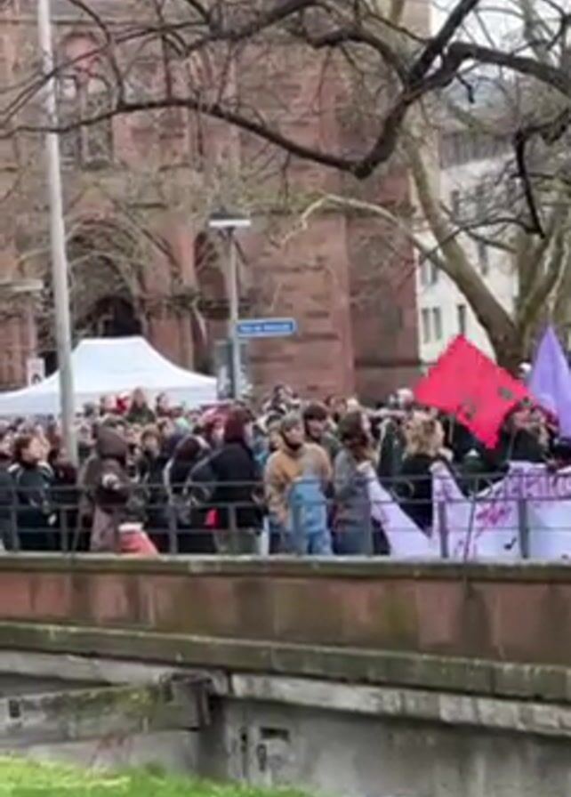 large crowd of people gathered on a bridge, possibly participating in a demonstration or protest. The crowd appears dense, with people of various ages and ethnicities. They are carrying flags, banners, and signs, although the exact messages on these items are not clear. The crowd is standing on a stone bridge over a narrow canal or waterway. The water in the canal appears murky and there is some green vegetation growing along the edge of the canal. Behind the crowd and across the bridge, there is a large brick building with prominent arches and windows. The building appears to be an older, possibly historical, structure. There are several light poles and bare trees visible in the background, suggesting a public square or park-like setting. The weather appears to be overcast or cloudy. The audio appears to capture the sound of chanting or shouting, suggesting that the crowd is actively engaged in a demonstration or protest.