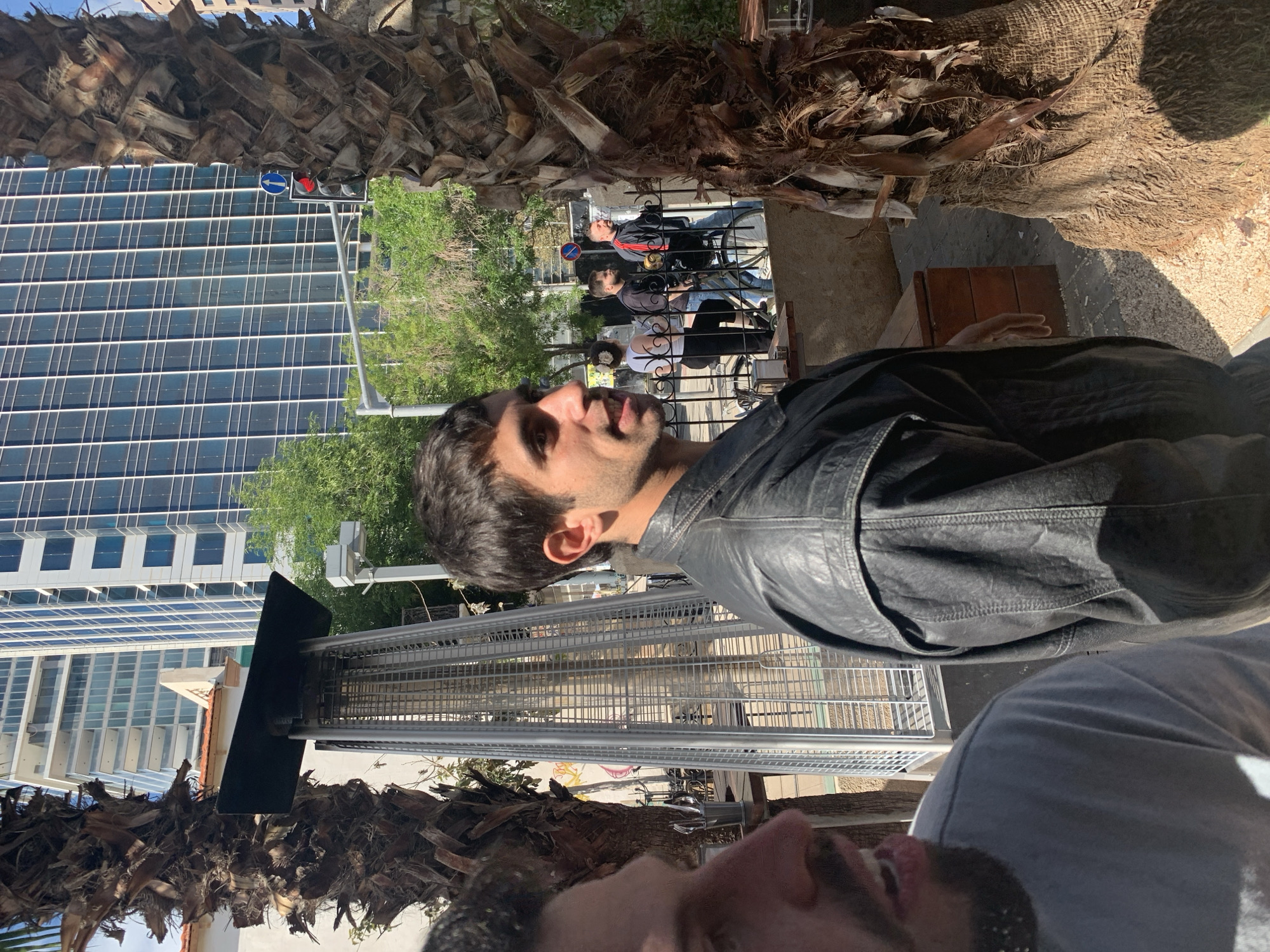 A man with dark hair and a black leather jacket is the primary subject, partially visible from the shoulders up. He is looking towards the left. Another man’s face is partially visible near the bottom edge, looking towards the left as well. In the background is a building with many windows, indicative of an office or apartment structure. A traffic light and street sign are present near the building. A metal heater and a section of a palm tree are visible. There are people seated at tables, suggesting an outdoor cafe or dining area. Given the building style and presence of palm trees, the location is likely Tel Aviv, Israel.