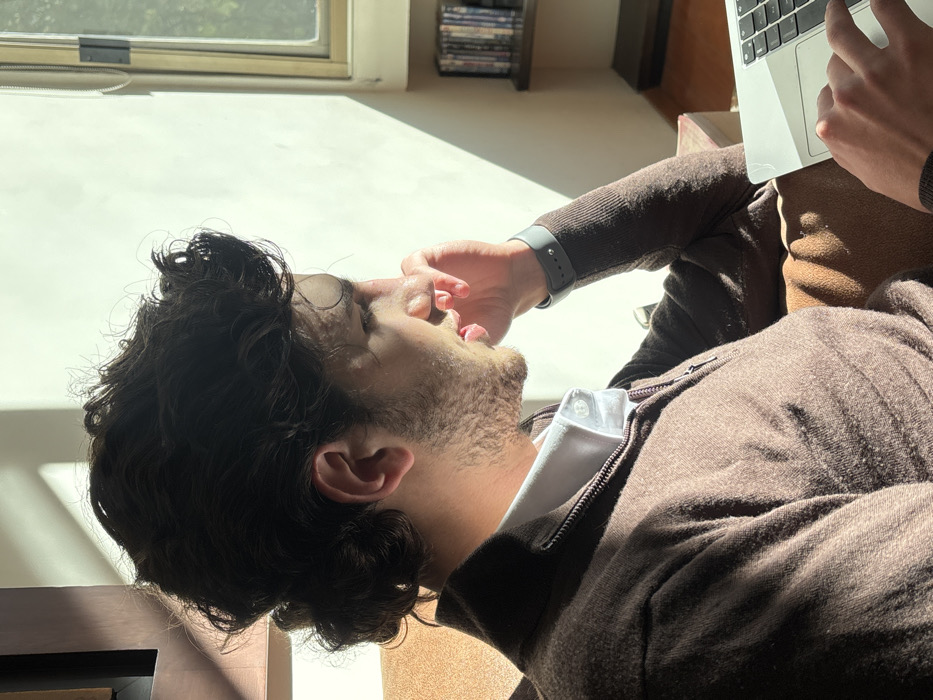 A man with dark, curly hair and a beard is lying down. He wears a brown zippered sweater over a white shirt, and a smartwatch on his wrist. He's holding a laptop partially above his face, obscuring his forehead and eyes. Sunlight streams in from a window in the background. A bookshelf filled with books is visible near the window.