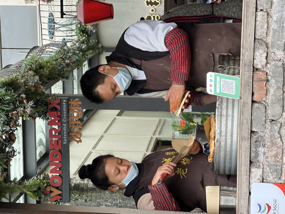 Two people wearing face masks prepare food. One person spreads sauce on bread while the other handles food with tongs. A green QR code sticker is visible. Behind them is a sign that says "WONDERMIX Splendid Creamery." Decorations and a red lantern are also in the background.