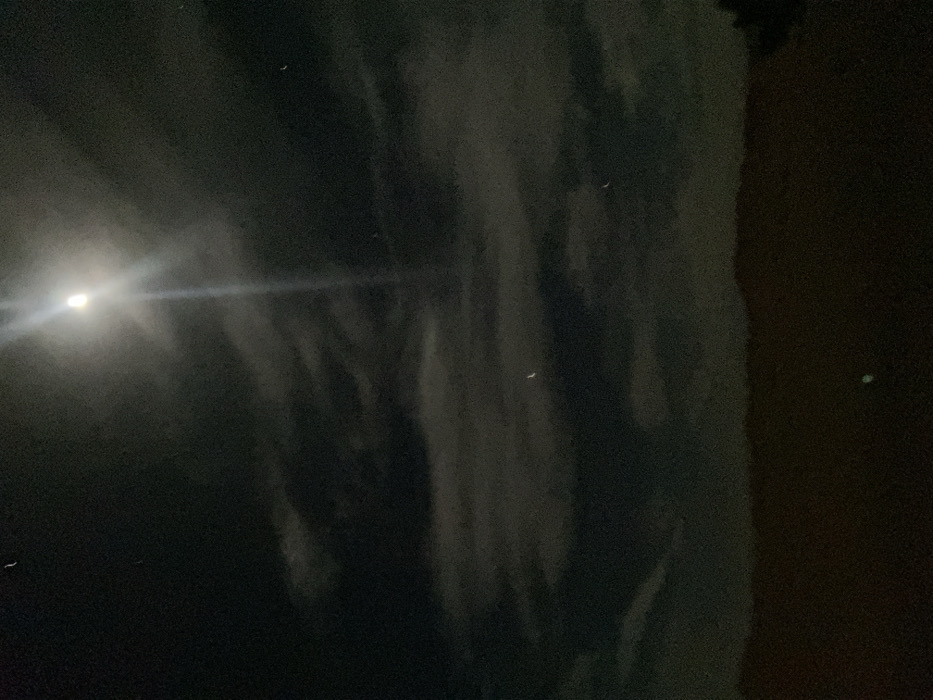 The image depicts a night scene, seemingly a moonlit sky. A bright celestial object, likely the moon, shines prominently on the left, radiating light. Wispy, undefined shapes, possibly clouds, stretch across the middle section, obscuring parts of the background. The right side is very dark, suggesting a shadowed area. Several small, bright specks are scattered throughout, potentially stars or distant lights.