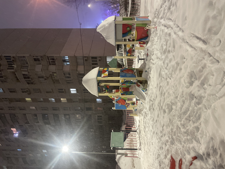 A forensic description of the scene reveals a snow-covered children's playground at night in a residential area of Moscow, Russia, during active snowfall