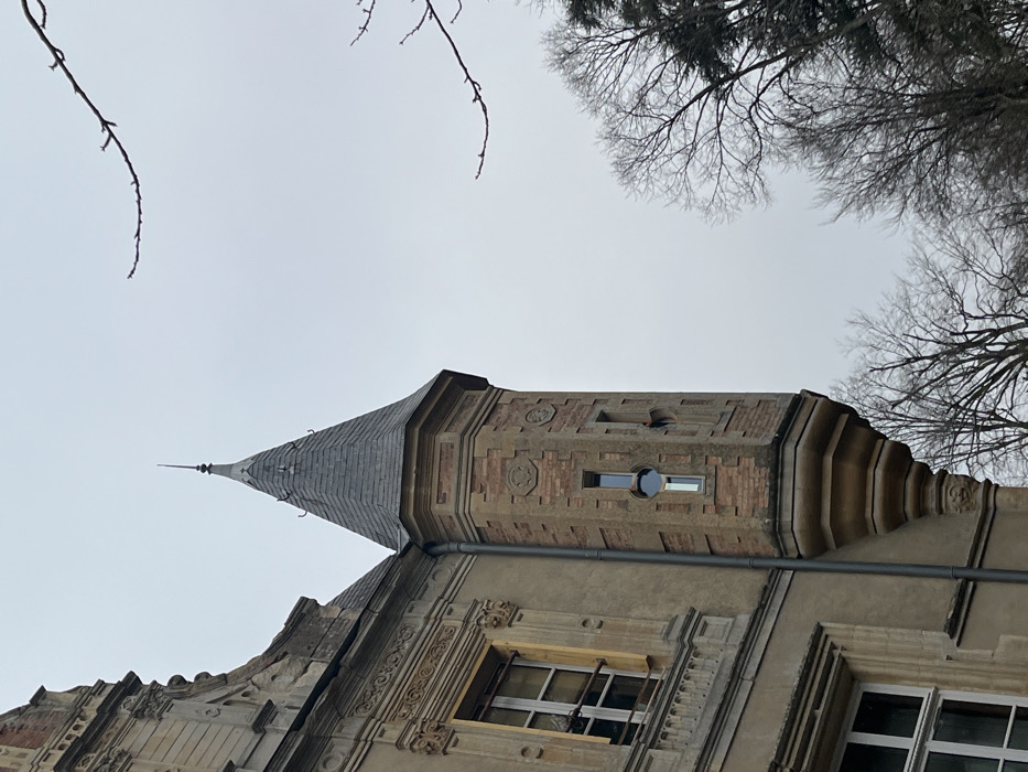 The image displays an exterior view of an architectural structure located in Bagnoles de l'Orne Normandie, France, under an overcast grey sky. The scene focuses on a section of a building featuring a prominent octagonal turret. The main building facade, partially visible on the left, is constructed of light brown or beige material, possibly stucco or stone, and exhibits ornate architectural detailing around its windows and upper sections. An open, rectangular window with a visible wooden interior frame is present on the main facade. The octagonal turret is built with reddish-brown brick, featuring decorative lighter stone or stucco elements. It contains small, recessed windows; one is an elongated rectangle, and another below it is circular, both with white frames. A dark figure, consistent with a person's head and shoulder, is partially visible leaning out of one of the turret's lower windows. A dark vertical drainpipe runs down the side of the building, connecting to the turret. The turret's base is supported by an ornate, multi-layered stone corbel. The turret is capped by a conical roof covered in dark slate tiles, culminating in a slender metallic spire at its apex. Several decorative hooks or finials are visible at the base of the turret roof. In the background, particularly on the right side of the frame, are numerous bare deciduous tree branches and the darker foliage of evergreen trees, all silhouetted against the pale, diffused light of the sky. A distinct bare tree branch extends into the upper right quadrant of the image.