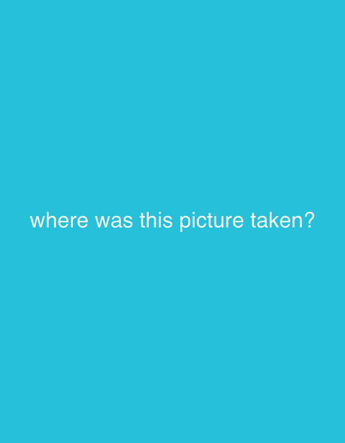 The image displays a solid teal-blue background. Centered horizontally in the lower-middle section, white sans-serif text reads, "where was this picture taken?". No people, physical subjects, objects, or actions are depicted. The environment is entirely abstract, consisting solely of a digital color field and text. There are no visual cues within the image to indicate a specific physical location, including any in Louisville, United States.