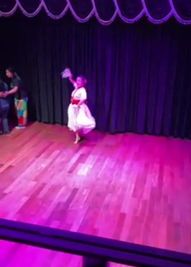 A young girl performs a traditional Mexican dance on a wooden stage. She wears a white dress with a red sash and has a flower in her hair. She holds a white fan and twirls it as she moves. The stage is lit with purple light. Behind her is a black curtain with white scalloped trim. To the left of the stage, a group of musicians is present. A person sits in the foreground in what looks like a balcony position watching the performance.