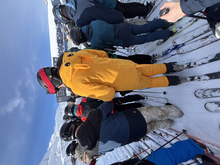 The image depicts a crowded ski lift queue or gathering area within a ski resort in Klösterle, Austria, under a clear blue sky with bright sunlight. Approximately 10-15 individuals, predominantly skiers, are visible standing on packed snow and wooden planks. A central figure, viewed from behind, wears a distinctive bright yellow, full-body character costume featuring ear-like protrusions and a small tail, paired with a black ski helmet and a red goggle strap. To their immediate left, a person is dressed in a dark blue and black ski jacket over tan camouflage-patterned ski pants, also wearing a black helmet. To the right, another individual wears a dark teal ski jacket, dark blue ski pants, and a black helmet. Other individuals in various ski gear and helmets are interspersed throughout the queue. Multiple pairs of skis are attached to boots on the snow-covered ground, and several ski poles are visible. In the background, a black information board with illegible text stands near a ski lift station featuring multiple seated chairs. Snow-covered mountains rise under the bright sky, with power lines visible extending up a distant slope.